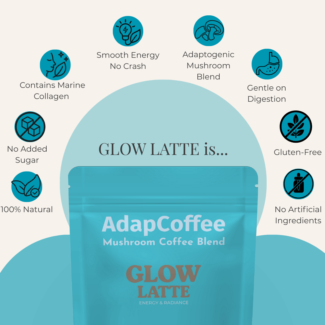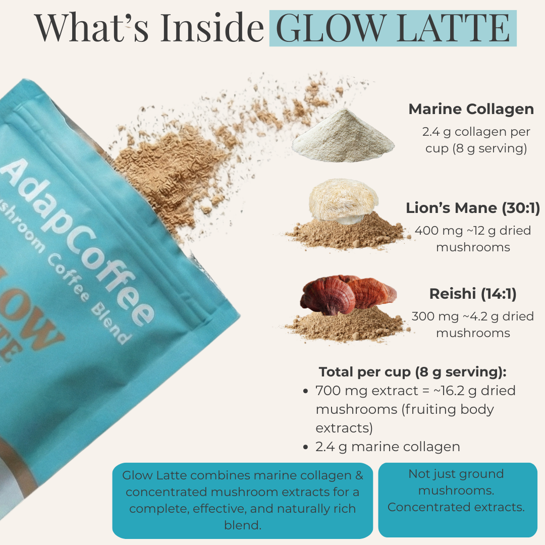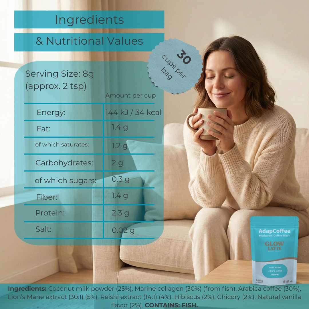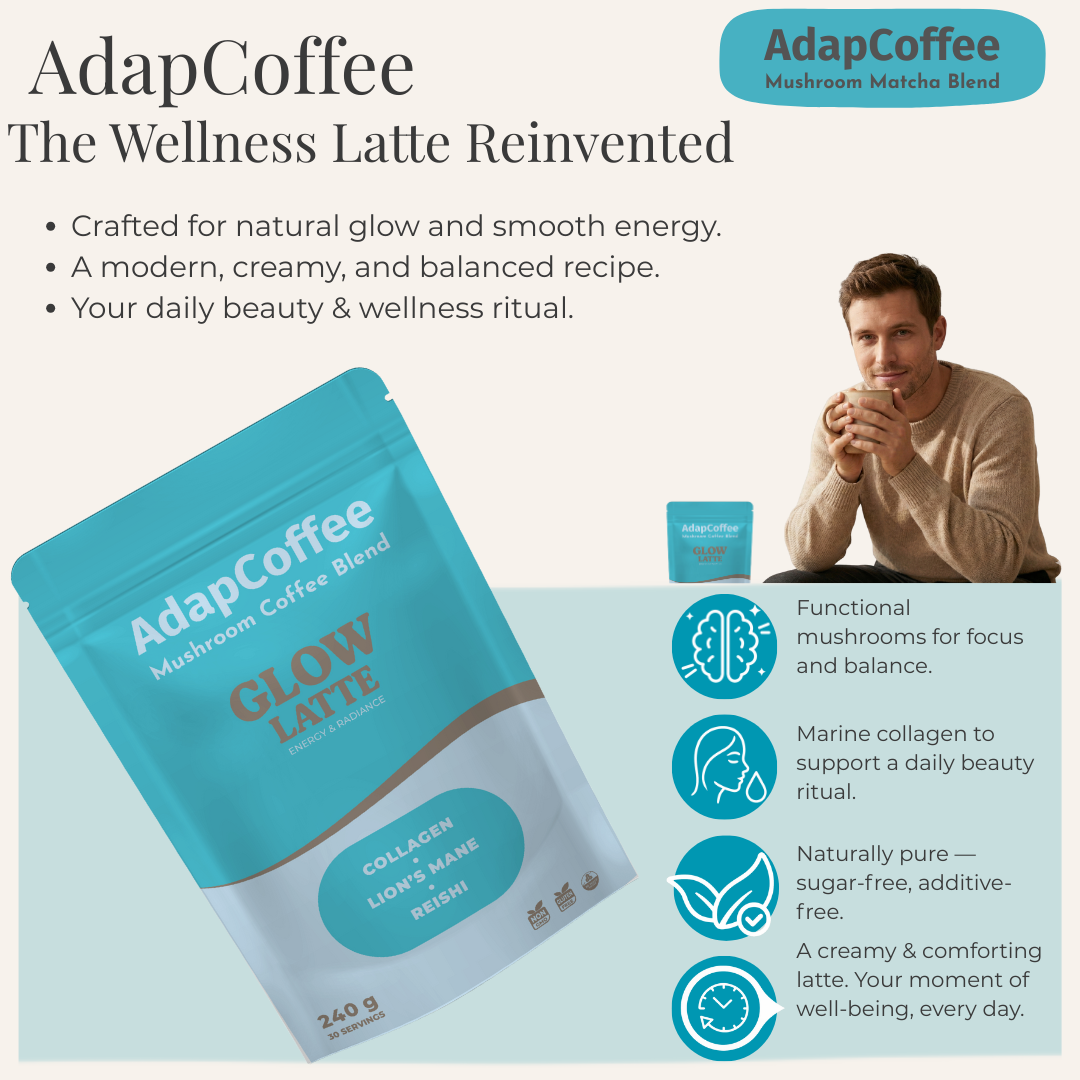 Grazie alla sua combinazione unica di funghi adattogeni, collagene marino e ingredienti di origine naturale, Glow Latte by AdapCoffee accompagna la tua quotidianità con dolcezza e gusto: