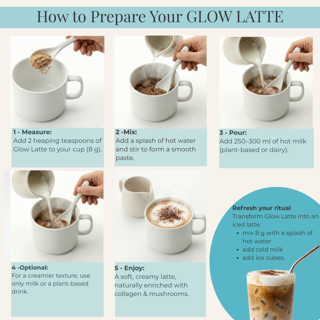 Aggiungi 2 cucchiaini colmi (8 g) di Glow Latte nella tua tazza. Versa un po' d'acqua calda e mescola, quindi completa con 250-300 ml di latte caldo (vegetale o classico). Per una consistenza ancora più cremosa, puoi utilizzare solo latte. Glow Latte si gusta anche in versione ghiacciata: mescola 8 g di polvere con poca acqua calda, aggiungi latte freddo e alcuni cubetti di ghiaccio. Goditi un latte dolce, cremoso e confortante, naturalmente arricchito con collagene marino e funghi adattogeni.